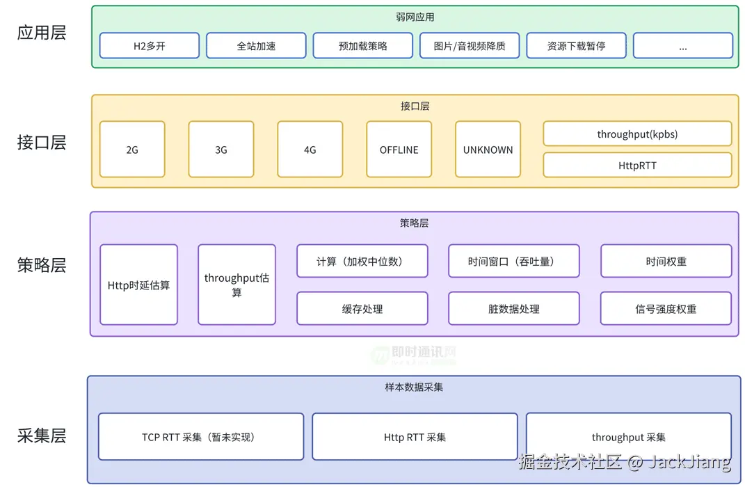 通过监听App内的Http请求,按照一定策略采集HttpRTT、吞吐率样本,以加权中位数(时间权重、信号强度权重)的方式综合估算出HttpRTT、吞吐率,最后根据HttpRTT、吞吐率按照一定的策略划分出真实网络类型。