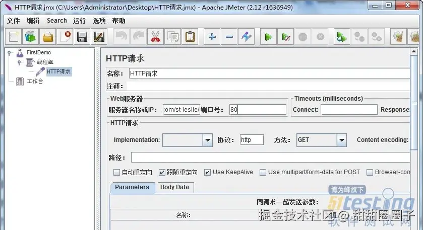 注意:在输入的时候切记不要将"http://"输入其中这样jmeter会出错,直接写WWW即可,本题也就是输入www.cnblogs.com/st-leslie/