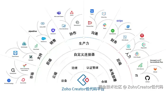 Zoho Creator低代码平台支持与您的CRM、ERP系统、数据库和您已经使用的其他工具连接。集成后,您可以直接从Zoho Creator低代码平台跨系统执行各种操作。