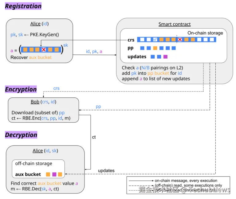 在RBE系统中,每个用户自己生成一对密钥(包括公钥和私钥)。用户还需要基于他们的私钥和一个公共参考字符串(CRS)来计算一些更新值(图中标记为 a)。这些更新值用于系统中的进一步操作。公共参考字符串(CRS)的存在意味着系统的设置并非完全不需要信任。然而,CRS的生成过程采用了一种称为 tau 的幂的构造方法。这种构造方法可以在链上通过多个参与者协作计算完成。只要有至少一个参与者是诚实的,这个 CRS 就是安全的。