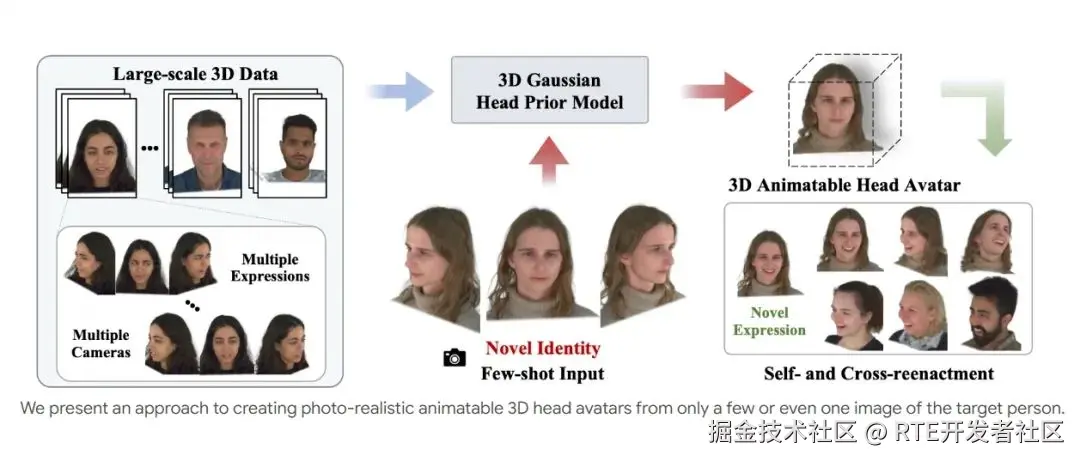 字节跳动和上海科技大学的研究人员开发了一项名为 「HeadGAP」 的研究,可以仅通过三张目标人物不同视角的照片,快速创建出高仿真、可动画化的 3D 虚拟人头部形象,并且可以根据参考视频实现面部表情同步。
