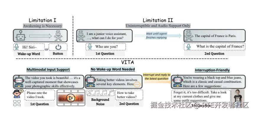 VITA 的双重模型部署使其能够生成对用户查询的响应,并且持续跟踪环境输入以确保交互的精准性和及时性。此外,VITA 不仅能够作为聊天伙伴,还能在健身或旅游时提供相应建议,并且能够根据提供的图片或视频内容回答问题。(@机器之心)