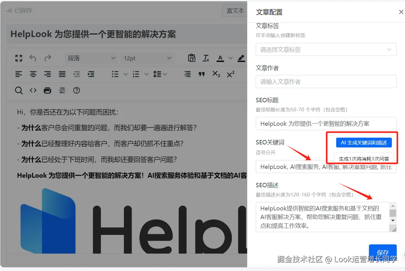 HelpLook通过接入AI模型,如GPT-4o-mini、豆包、文心一言等,可以实现智能客服的自动化服务;自动分析和整理知识内容,为用户提供准确的搜索结果和相关的知识推荐;提供数据分析和用户反馈板块;定制AI ChatBot问答机器人;同时拥有强大的编辑器,导入或写完文章后可以AI一键生成文章摘要、SEO关键词和描述。感兴趣的话可以通过邀请🐎【LookLook111】,免费体验HelpLook。