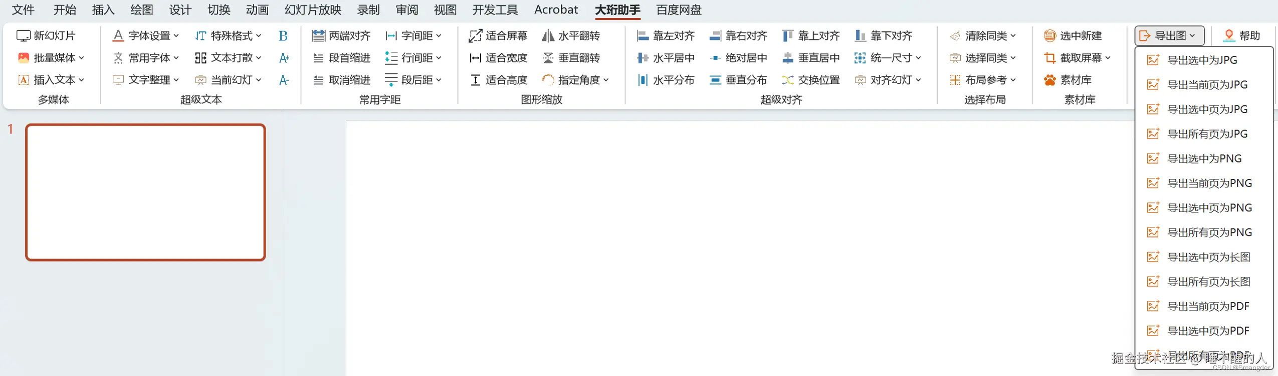 在日常交稿的时候,为便于交流,或不希望别人修改,需要将PPT存成也一张页面连续的长图,因此开发了导出长图功能,另外还可以将选中的幻灯片导出为长图,导出pdf等功能。