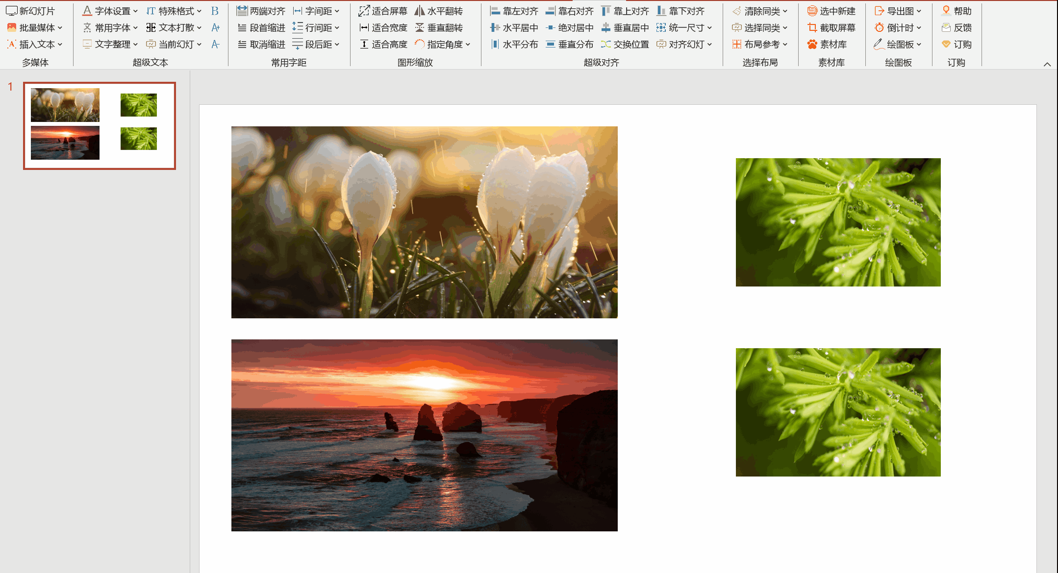 将选中的大量图片,按其在当前幻灯片的位置,每页幻灯片一个图的方式,复制到幻灯片中。又分两种情况,新建分布是复制到新建的空白幻灯片中;当前分布是分布到本页后面的幻灯片中,直到图片分布完或无新的幻灯可用
