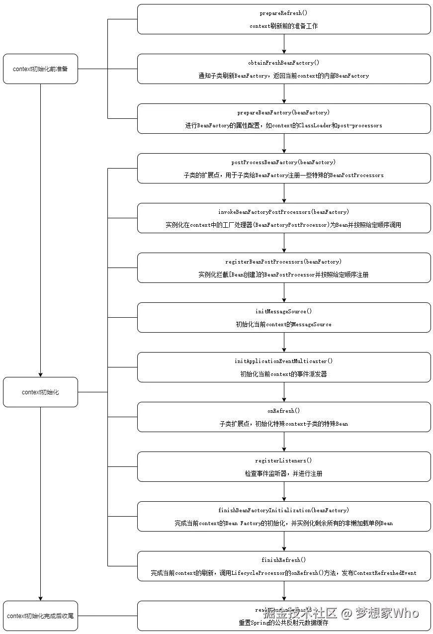 refresh()方法主要分为三个阶段,分别为context初始化前准备、context初始化、context初始化完成后收尾,整体流程如下图所示: