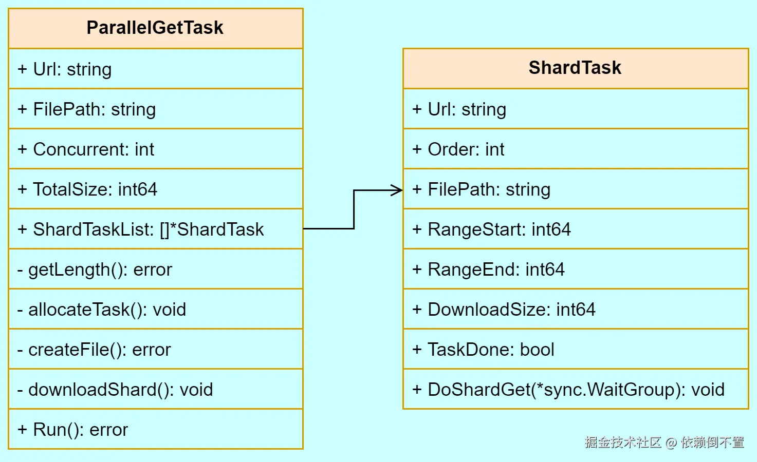 getLength发送HEAD请求获取Content-Length以获取文件大小,获取后将其设定到TotalSize属性allocateTask根据给定的线程数和获取到的文件大小,计算每个线程下载的文件内容范围,并创建对应的ShardTask结构体放入ShardTaskList中createFile根据getLength获取到的待下载文件大小,创建一个相同大小的空白文件,用于接收下载内容downloadShard为每一个ShardTask对象创建一个线程(Goroutine)并在新的线程中调用ShardTask对象的下载分片方法,以启动所有线程的下载任务,并通过sync.WaitGroup来等待全部线程完成Run启动整个多线程下载任务,该函数是暴露的公开函数,其中对上述每个步骤函数进行了组织,按顺序调用执行