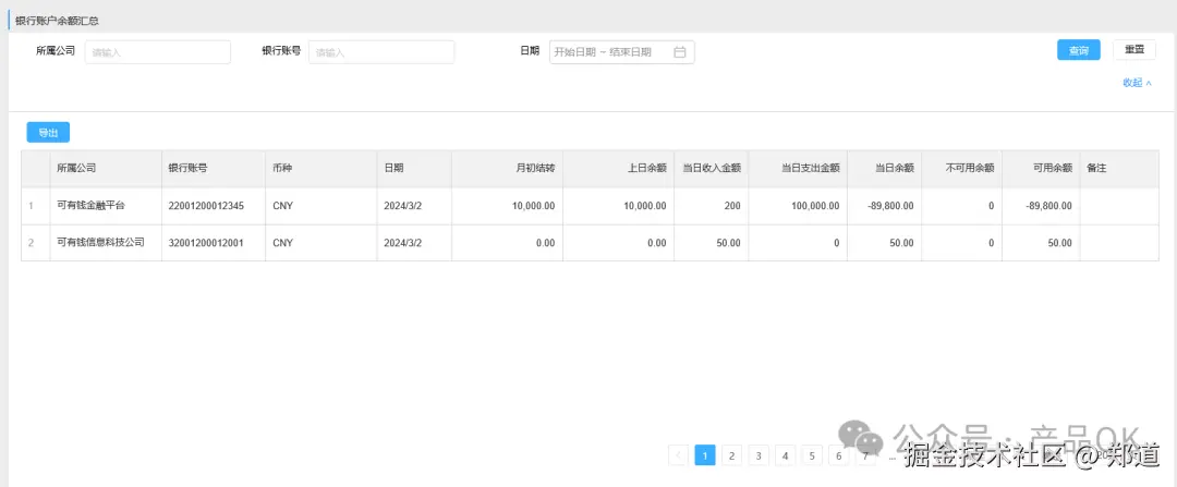查询、导出:展示各银行账户每日变动金额、期初余额额、期末余额、可用金额、不可用金额。