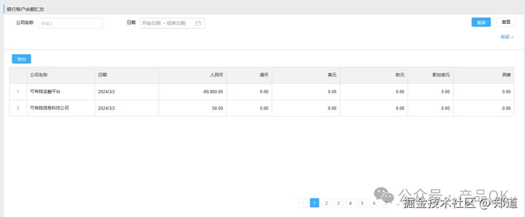 查询、导出:支持查询并导出各公司每日不同币种的资金余额。