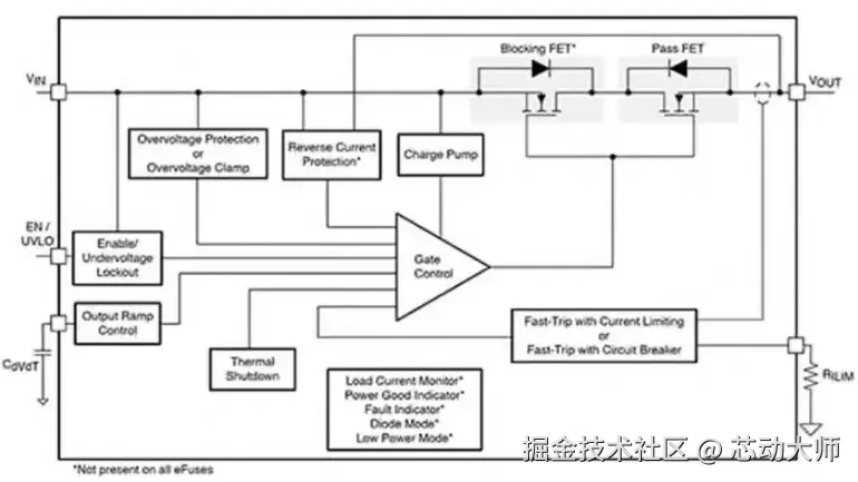 - 过压保护:借助一些额外的电路,eFuse还可以提供过压保护,以防止浪涌或感应跳闸即当输入电压超过设定的过压跳闸点时,切断FET并在过压条件持续期间保持在断开状态