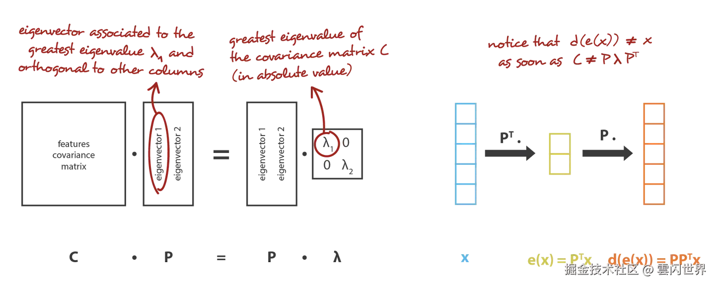 在我们的全局框架中,我们在 n_e x n_d 矩阵(线性变换)系列 E 中寻找编码器,这些矩阵的行是正交的(特征独立性),并在 n_d x n_e 矩阵系列 D 中寻找相关的解码器。可以证明,对应于协方差特征矩阵的 n_e 个最大特征值(范数)的酉特征向量是正交的(或可以选择正交),并定义维度为 n_e 的最佳子空间,以最小近似误差投影数据。因此,可以选择这些 n_e 个特征向量作为我们的新特征,这样,降维问题就可以表示为特征值/特征向量问题。此外,还可以证明,在这种情况下,解码器矩阵是编码器矩阵的转置。