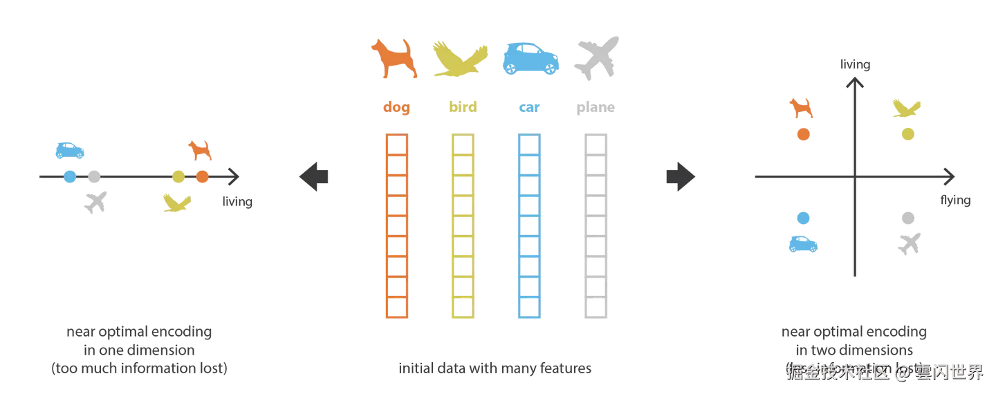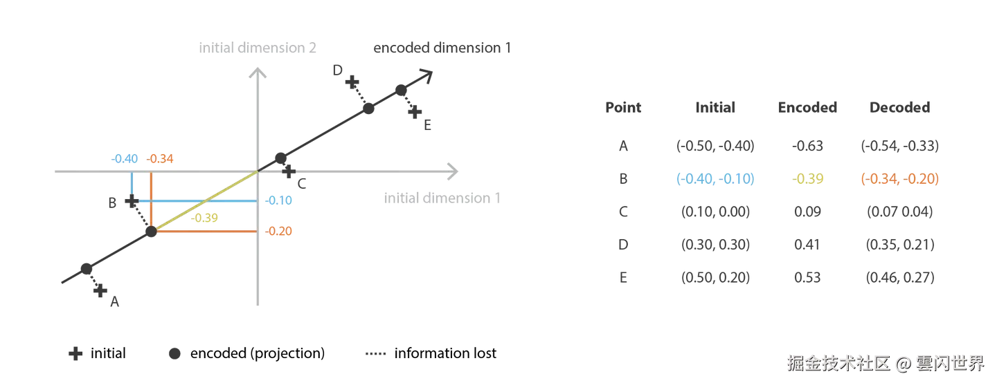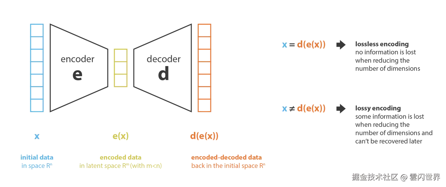降维、PCA 和自动编码器。欢迎来到雲闪世界。 在第一部分中,我们将首先讨论一些与降维相关的概念。特别是,我们将简要回顾主成分分析 (PCA) 和自动编码器,展示这两个概念是如何相互关联的。 什么是降维? 在机器学习中,降维是减少描述某些数据的特征数量的过程。这种减少是通过选择(仅保留一些现有特征)或提取(基于旧特征创建少量新特征)来完成的,并且在许多需要低维数据(数据可视化、数据存储、大量计算……)的情况下非常有用。虽然存在许多不同的降维方法,但我们可以设置一个与大多数(如果不是任何!)这些方法相匹配的全局框架。 首先,我们将从“旧特征”表示(通过选择或提取)产生“新特征”表示的过程称为编码器,将解码器称为逆过程。降维可以解释为数据压缩,其中编码器压缩数据(从初始空间到编码空间,也称为潜在空间),而解码器解压缩数据。当然,根据初始数据分布、潜在空间维度和编码器定义,这种压缩可能是有损的,这意味着部分信息在编码过程中丢失,并且在解码时无法恢复。