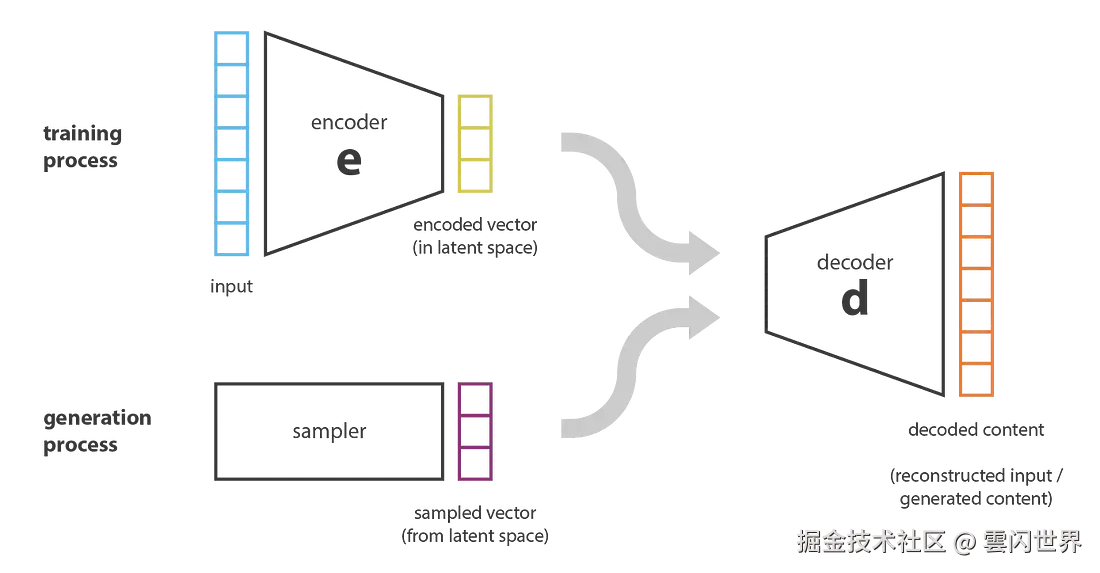 - 由于过度拟合,自动编码器的潜在空间可能非常不规则(潜在空间中相近的点可能会产生非常不同的解码数据,潜在空间中的一些点在解码后可能会产生毫无意义的内容,......),因此,我们无法真正定义一个生成过程,该过程只是从潜在空间中采样一个点并使其通过解码器来获得新的数据