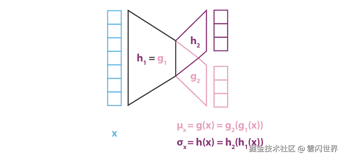由于它定义了 q_x(z) 的协方差矩阵,因此 h(x) 应该是一个方阵。但是,为了简化计算并减少参数数量,我们做出额外的假设,即 p(z|x) 的近似值 q_x(z) 是一个具有对角协方差矩阵的多维高斯分布(变量独立性假设)。在此假设下,h(x) 只是协方差矩阵对角线元素的向量,因此具有与 g(x) 相同的大小。但是,我们以这种方式减少了我们考虑用于变分推断的分布族,因此获得的 p(z|x) 的近似值可能不太准确。
