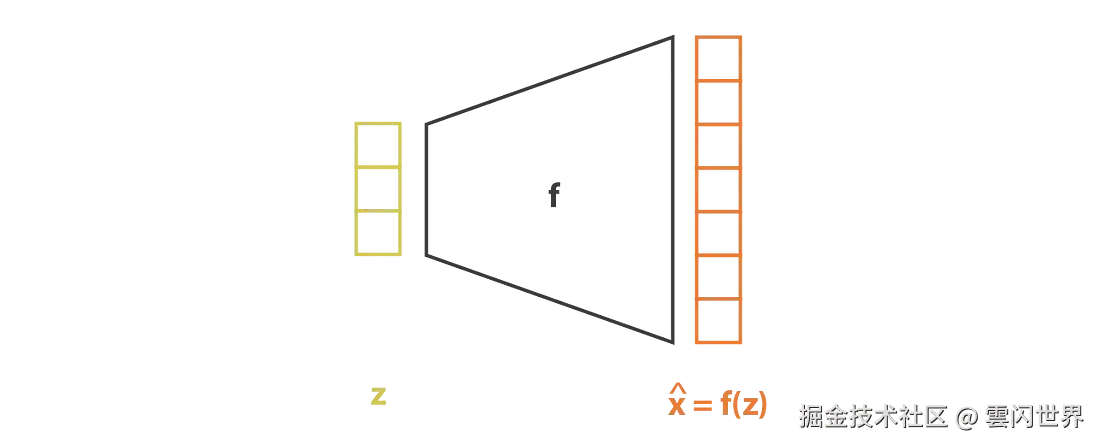 与对 p(z|x) 进行建模的编码器部分相反,我们将其视为均值和协方差均为 x(g 和 h)函数的高斯分布,而我们的模型假设 p(x|z) 为具有固定协方差的高斯分布。定义该高斯分布均值的变量 z 的函数 f 由神经网络建模,可表示如下
