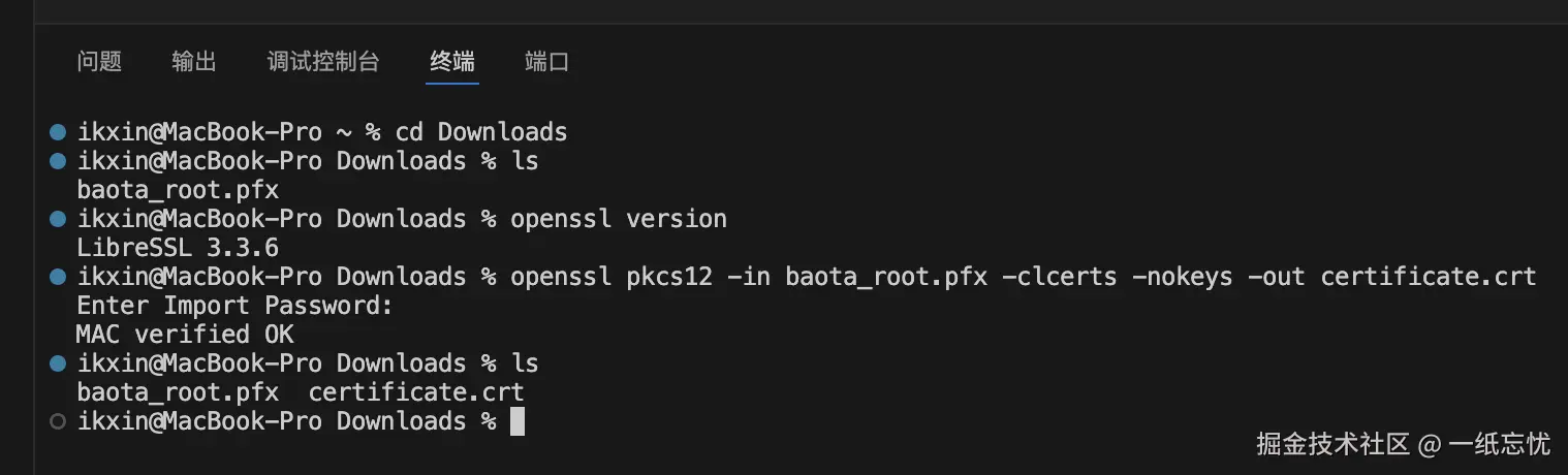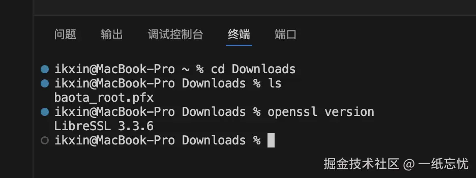 首先将面板的证书下载到本地电脑,然后在 macOS 终端进入到该目录,为了确保 OpenSSL 是否已经存在于系统中,先使用 openssl version 命令查看一下版本号,可以看到我的版本号是 3.3.6。