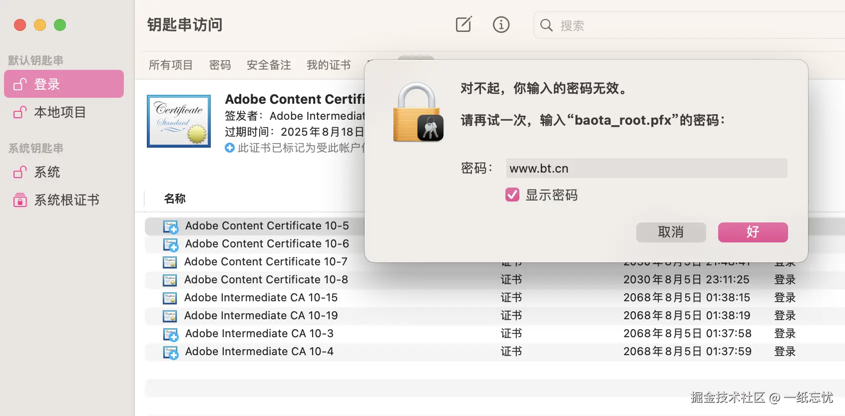 但是在官方的教程中却出现了一些奇怪的问题,在我的 MacBook Pro 中无法导入宝塔官方的根证书,按照教程内容下载了证书,并输入正确的密码 www.bt.cn,却提示 对不起,你输入的密码无效。