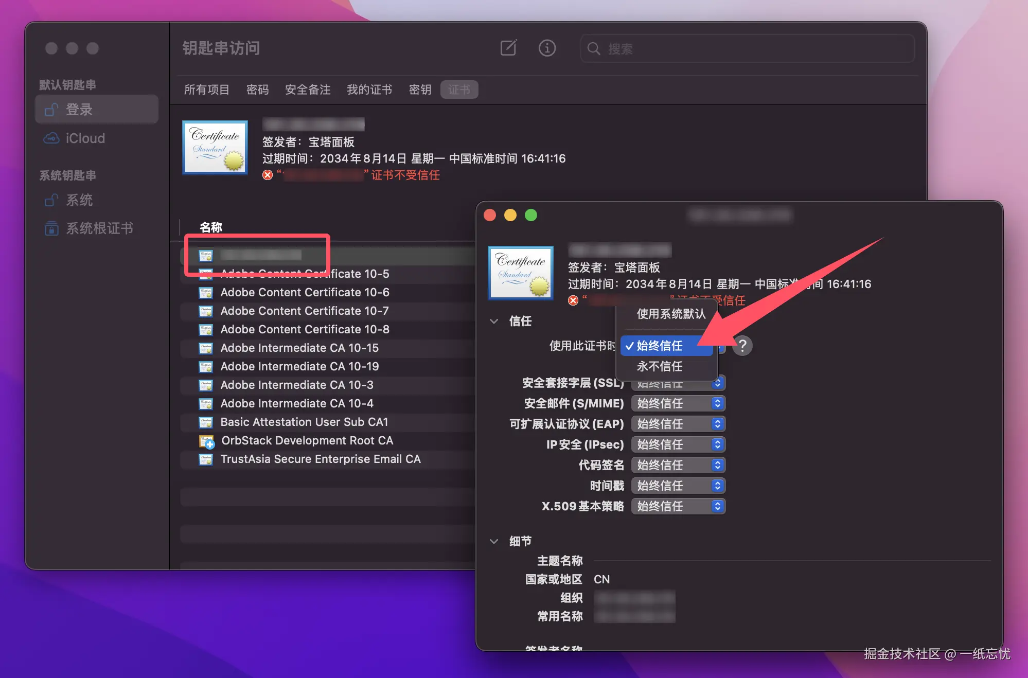 接下来回到访达,双击打开生成后的 certificate.crt 文件,会自动导入到钥匙串访问,双击打开该证书,在「信任」中设置「使用此证书时」为「始终信任」。