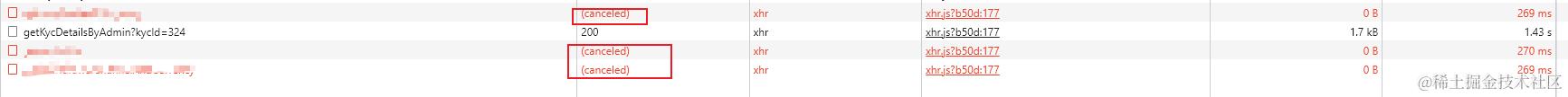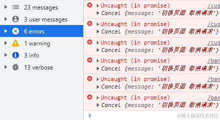 看到这里前端取消请求,就实现了;细心的小伙伴会发现:控制台输出了一堆:错误信息Uncaught (in promise)...这是因为 reject了错误,没有被处理,所以就抛到控制台了。这时候我们可以吧它给,屏蔽调。