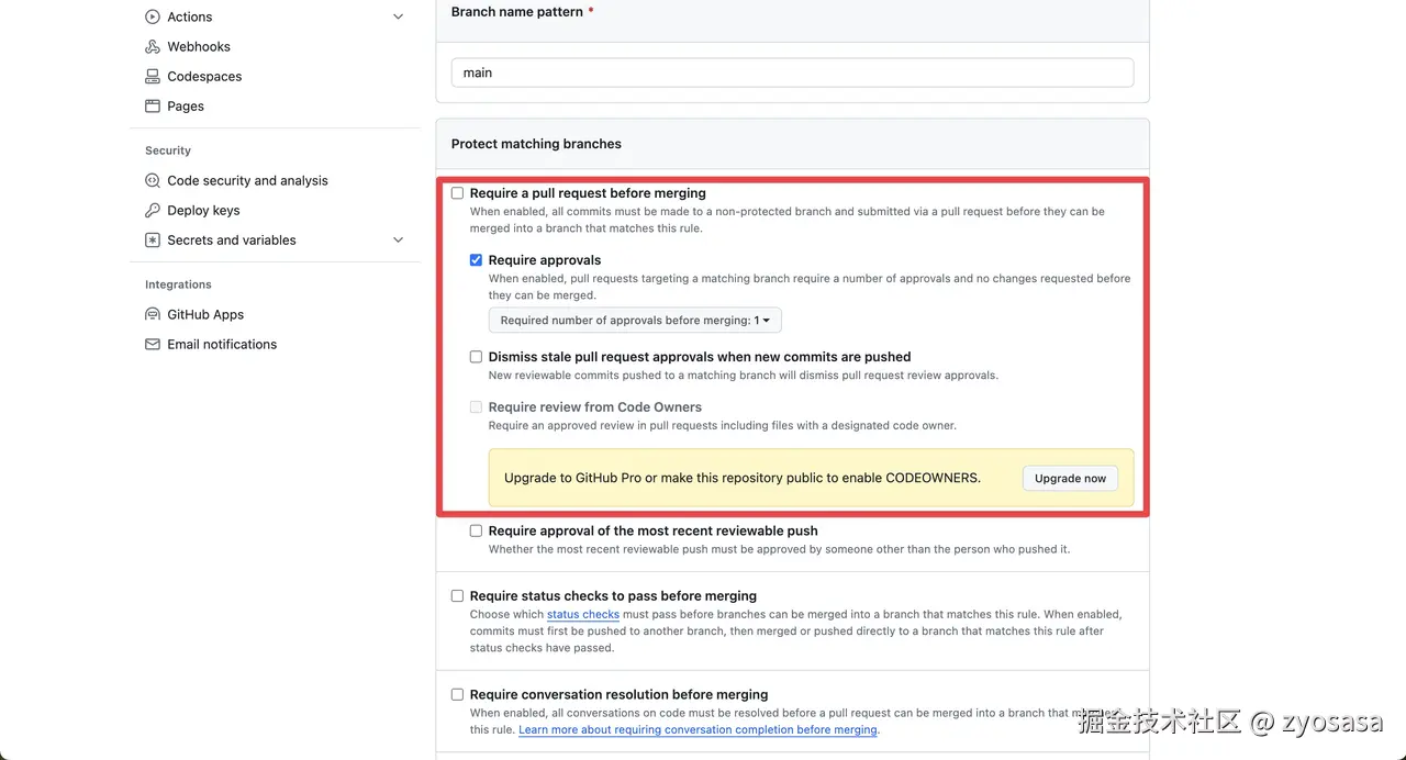 目前 Github 上免费支持 Public Repo (公共的代码仓库) 去进行设置分支保护规则,如果你是 Private Repo(私有化仓库)那么必须开通团队版或者更加高级版本才支持设置分支保护策略。