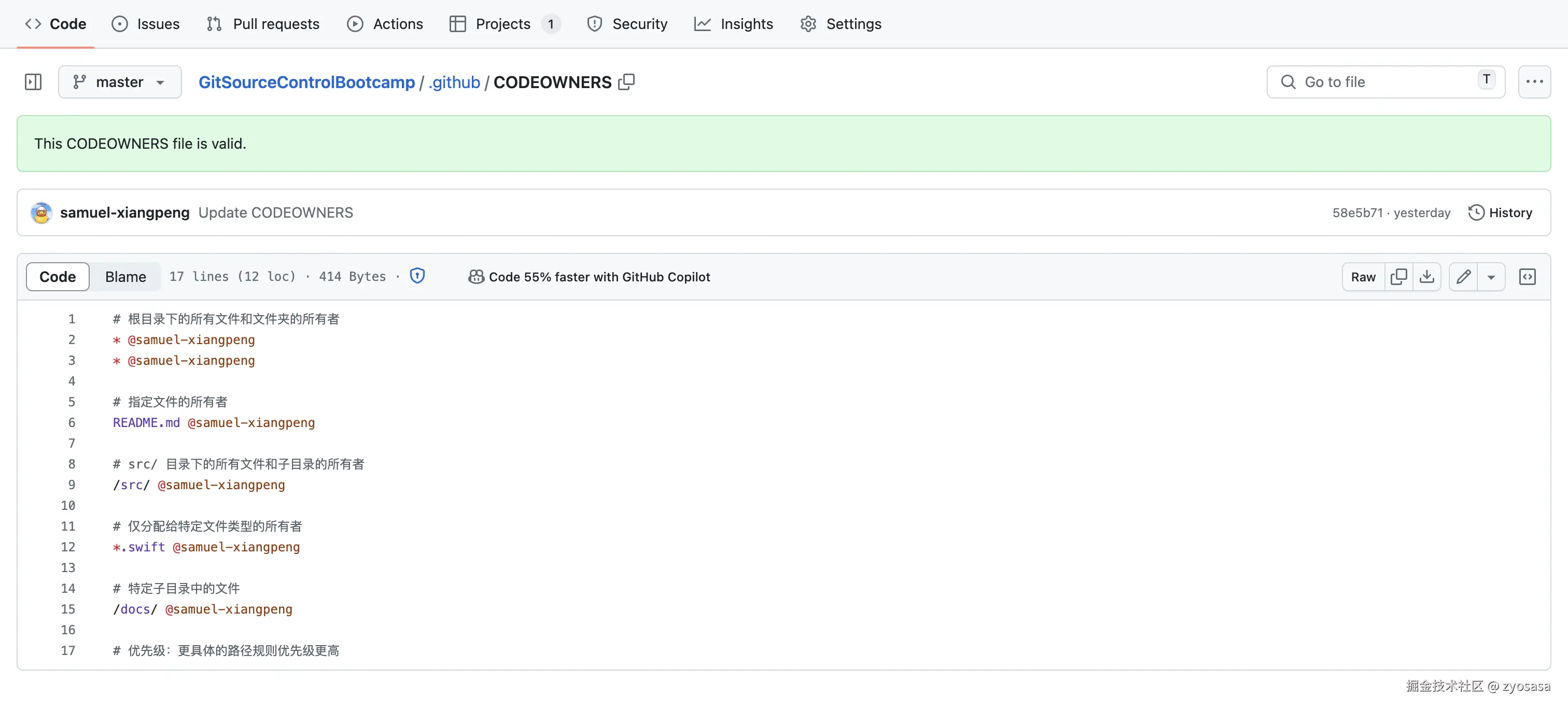 设置代码 CODEOWERS,也是可以更加明确当前仓库中不同人的负责的模块,可以根据文件进行设置或者根据语言设置负责人(代码所有者),同时也可以进行所有设置。