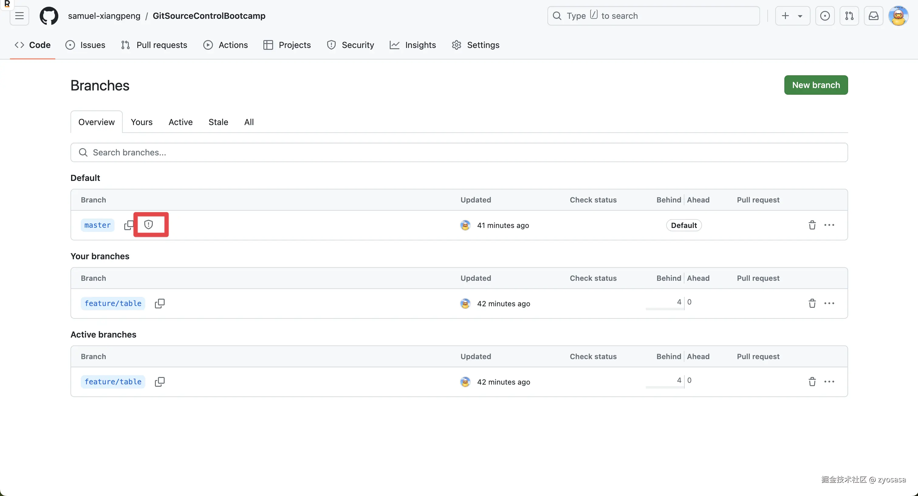 分支名称就是对应你需要进行保护的代码仓库分支,必须名称一样,配置结束后查看当前分支你就可以看到会有如下变化。