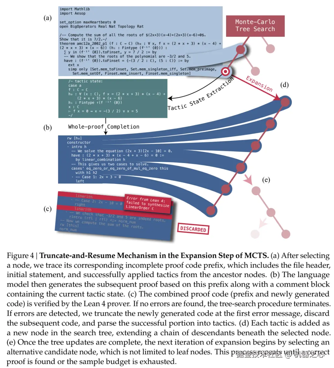 为了在整体证明生成设置中实现树搜索方法,该研究引入了证明树抽象来定义定制的状态和动作空间,并利用了截断和重新开始机制。研究者首先将不完整的证明分解为与各个证明步骤相对应的树节点序列,然后利用存储在这些树节点中的部分内容继续证明生成过程。图 4 说明了从整体证明生成构建证明搜索树的过程。