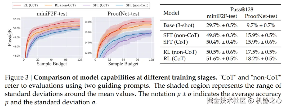 评估。图 3 给出了 miniF2F 和 ProofNet 数据集上每个训练阶段的比较分析。在大多数设置中,CoT 模式始终优于非 CoT 模式。