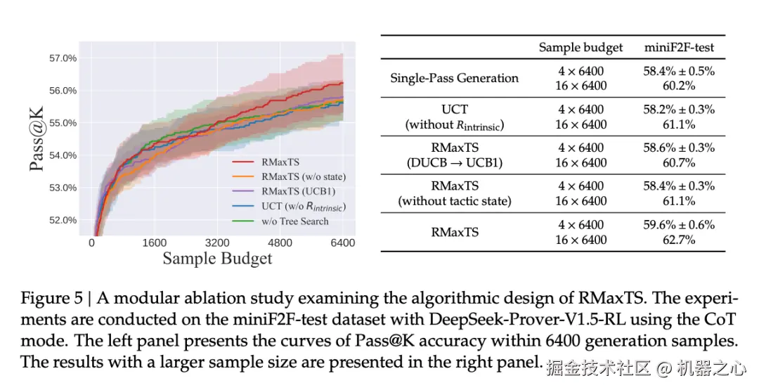 在消融实验中,研究者检验了 RMaxTS 的算法设计。实验是在 miniF2F 测试数据集上使用 DeepSeek-Prover-V1.5-RL 以 CoT 模式进行的。如图 5 所示,左侧显示了 6400 个生成样本内 Pass@K 准确率的曲线,右侧显示了样本量更大时的结果。