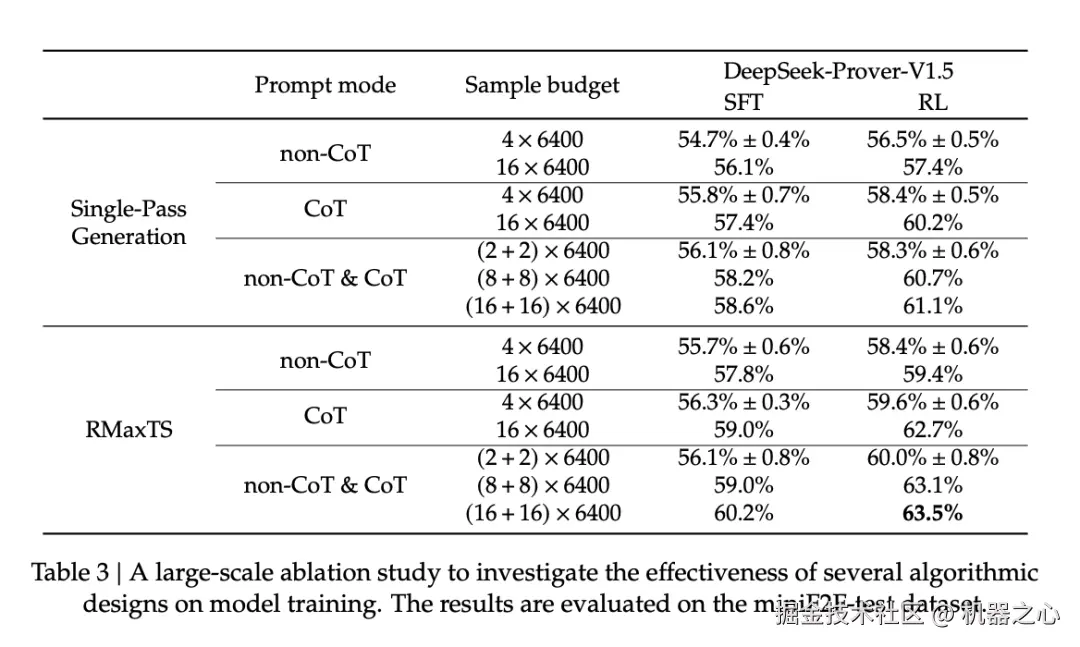 表 3 比较了两种生成模式,即非 CoT 和 CoT 在 miniF2F-test 数据集上的性能,表明随着样本预算的增加,CoT 相对于非 CoT 模式的优势被放大。
