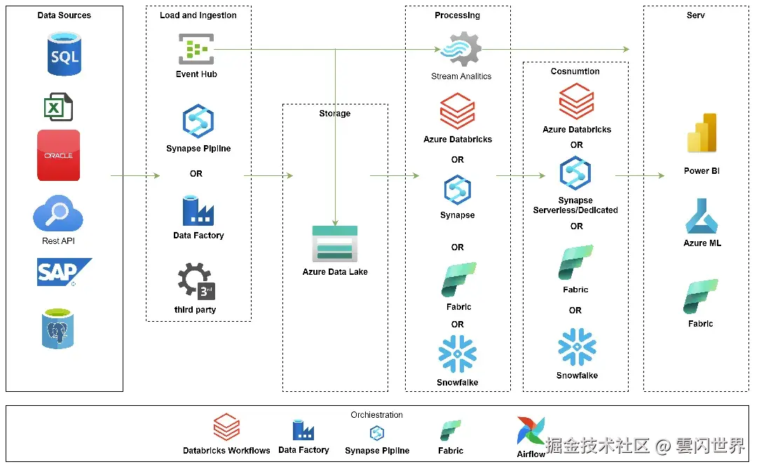 - 对于数据仓库,我们可以选择 Azure Synapse、Snowflake 或 MS Fabric Warehouse。
