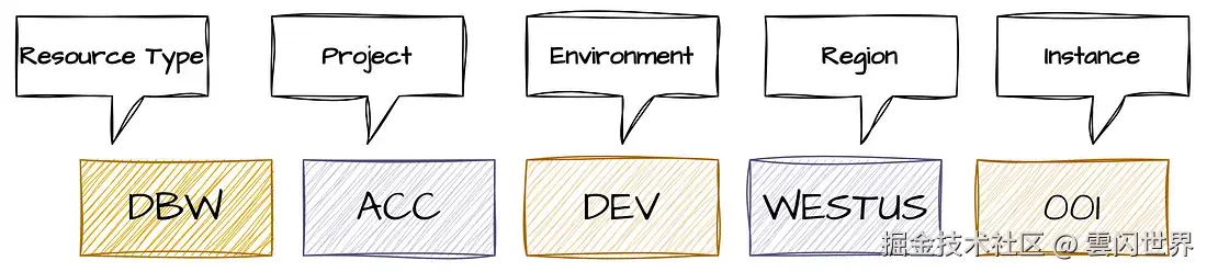 考虑命名约定时,您应该考虑要捕获的信息。标准应该易于遵循、一致且实用。值得包括组织、业务部门或项目、资源类型、环境、区域和实例编号等元素。您还应该考虑资源的范围,以确保名称在其上下文中是唯一的。对于某些资源(例如存储帐户),名称必须是全局唯一的。