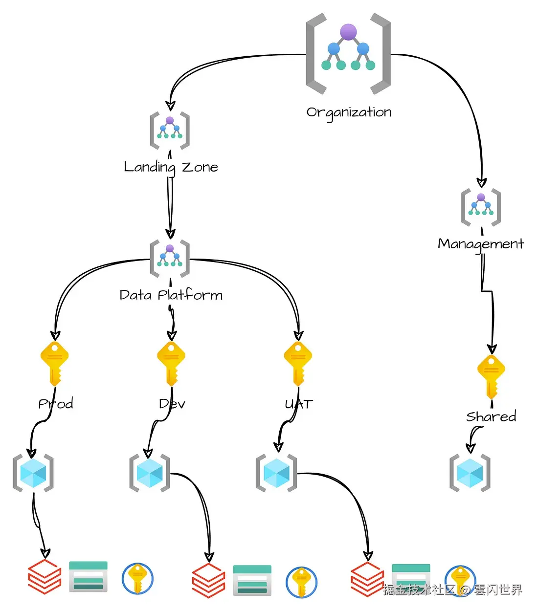 平台设计的一个重要方面是根据业务部门和软件开发生命周期规划订阅和资源组的细分。可以为生产环境和非生产环境使用单独的订阅。通过这种区分,我们可以实现更灵活的安全模型、为生产环境和测试环境制定单独的策略,并避免配额限制。