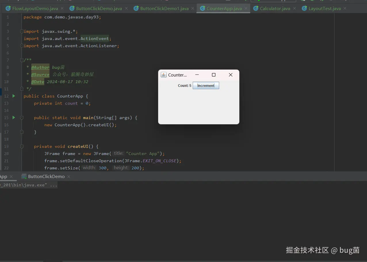 JButton button = new JButton("Increment");:创建一个JButton对象,按钮上的文字是"Increment"。 -