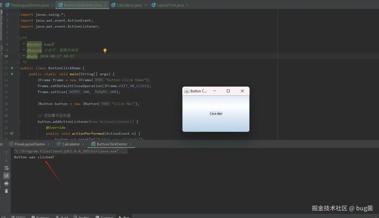 JFrame frame = new JFrame("Button Click Demo");:创建了一个JFrame对象,这是Swing中用于表示窗口的类。这里创建的窗口标题被设置为"Button Click Demo"。 -