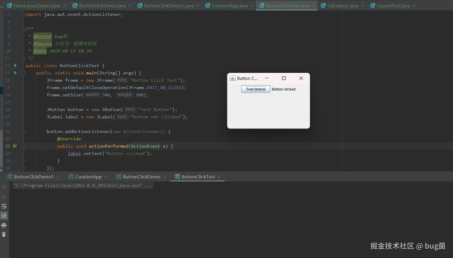 JFrame frame = new JFrame("Button Click Test");:创建一个JFrame对象,用于显示应用程序窗口,标题为"Button Click Test"。 -