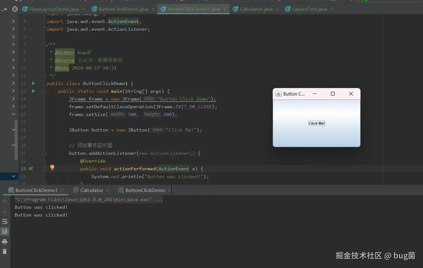 ActionListener的匿名类实现中:@Override:注解表明下面的方法覆盖了父接口的方法。public void actionPerformed(ActionEvent e):这是ActionListener接口中定义的方法,当按钮被点击时会被调用。System.out.println("Button was clicked!");:在控制台打印一条消息,表明按钮已被点击。