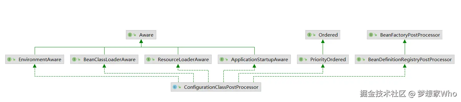 这个步骤中,涉及到Spring的一个核心类**「ConfigurationClassPostProcessor」**,该类在AnnotationConfigApplicationContext实例化阶段的设置AnnotatedBeanDefinitionReader步骤中已经完成了添加,其UML类图如下所示: