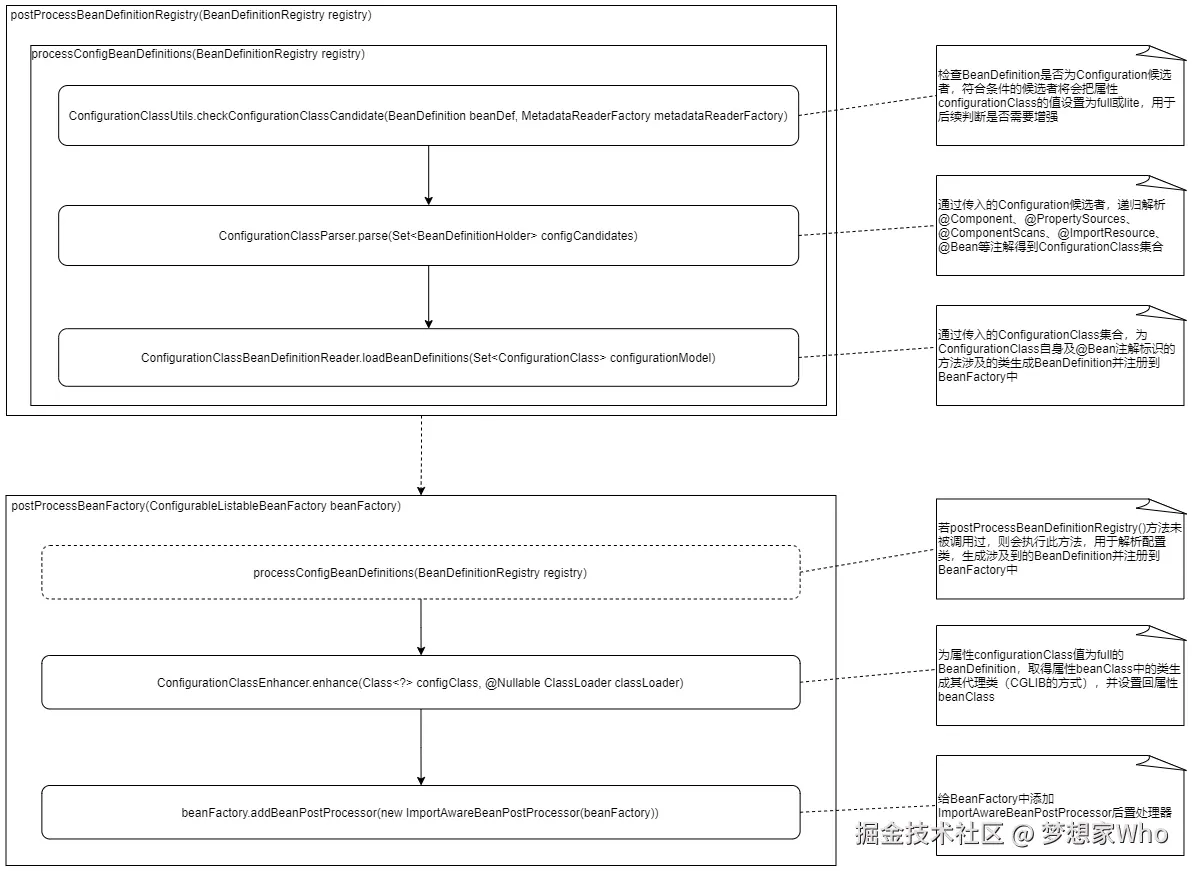 因此,「ConfigurationClassPostProcessor的核心为对接口BeanFactoryPostProcessor及接口BeanDefinitionRegistryPostProcessor的方法的实现」,对应实现方法的核心执行流程如下所示: