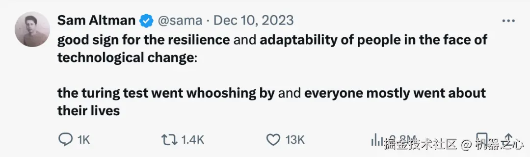 去年,OpenAI 的首席执行官山姆・奥特曼发文称:「面对技术变革,人们的适应能力和韧性得到了很好的体现:图灵测试悄然过去,大多数人继续他们的生活。」