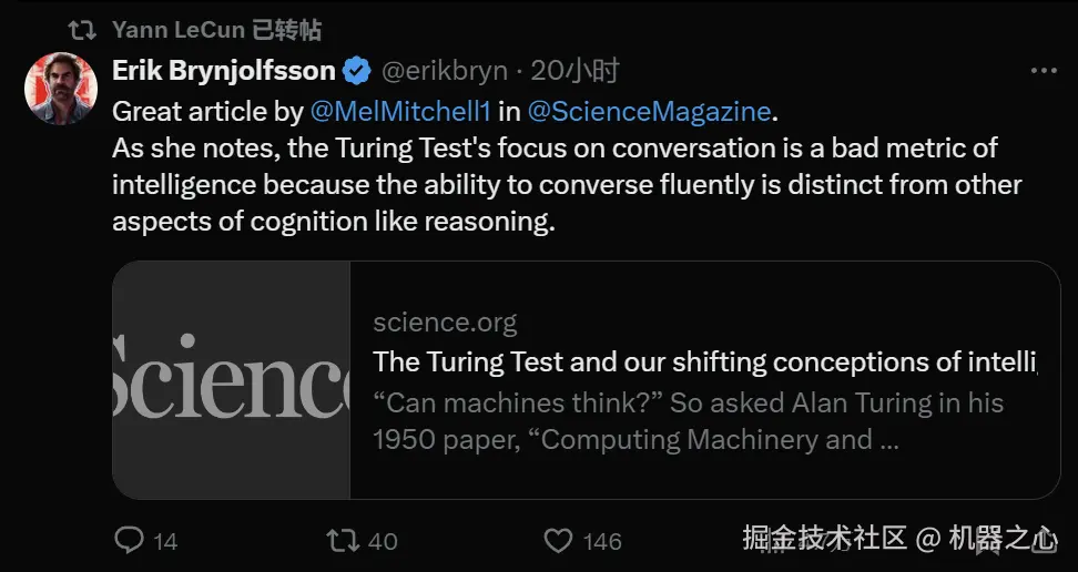 「图灵测试是一个糟糕的测试标准,因为对话能力和推理完全是两码事。」最近几天,AI 圈里一个新的观点正在流行。