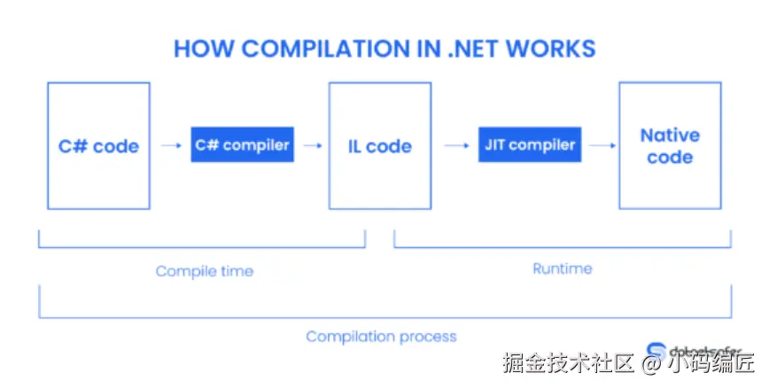 在这个过程中,C# 源代码被转换为可执行文件(exe或者dll 文件)。