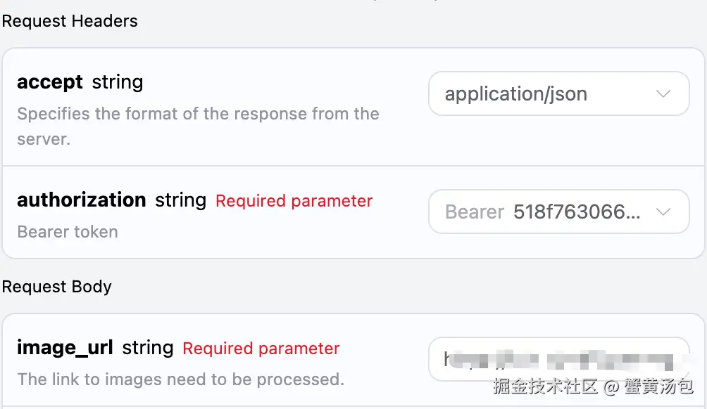 accept:想要接收怎样格式的响应结果,这里填写为application/json,即 JSON 格式。authorization:调用 API 的密钥,申请之后可以直接下拉选择。