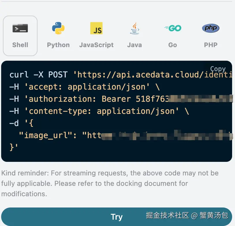 另外如果想生成对应的对接代码,可以直接复制生成,例如 CURL 的代码如下: