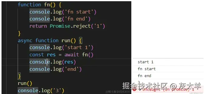 romise状态变成rejected,那么它将不会再把剩余任务推入到微任务队列,剩余的代码也就不会再执行了。(await不能提取reject的结果)