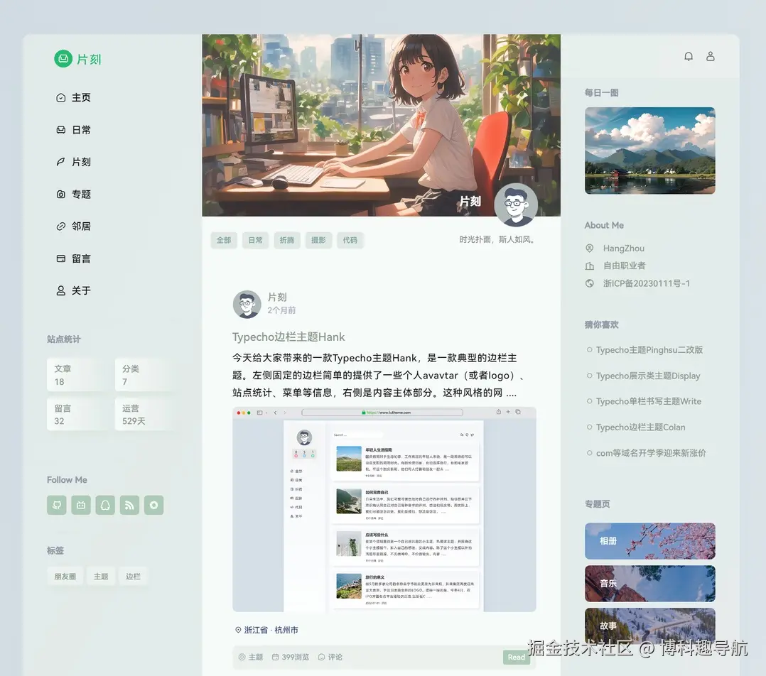 30多款个人博客、个人网站、个人主页div+css,html在线预览,个人静态页面模板(wordpress、帝国cms、typecho主题模板).这些简洁和优雅的博客网页模板,为那些想成为创建博客的个人或媒体提供灵感设计。网页模板可以记录旅游、生活方式、食品或摄影博客等网站。部分网页模板来源网友,演示仅为前端设计提供参考www.bokequ.com/blog/1/