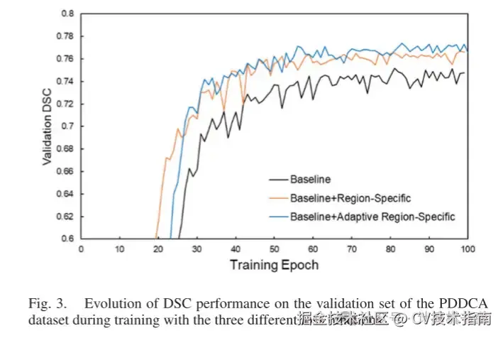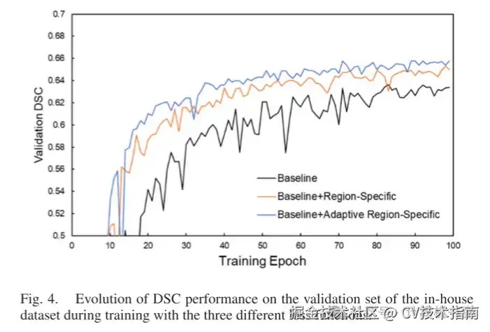 在训练期间,三个不同的损失函数在验证数据集上的 DSC 性能演变如图 3 和 4 所示,分别为 PDDCA 和内部数据集。可以观察到,验证性能随着学习过程逐渐增加,并在大约 80 个周期后逐渐饱和。使用自适应区域特定损失的学习曲线优于使用区域特定损失的曲线,并且两者都以明显的优势优于仅使用基线损失的曲线,展示了提出方法的好处。