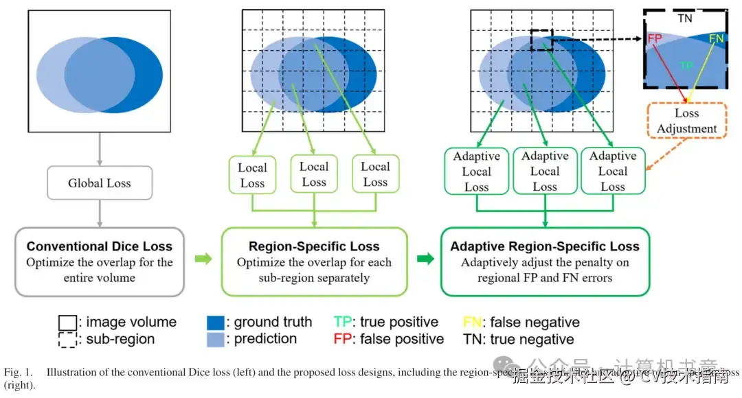 在本研究中,我们提出了一种区域特定的损失方案,以改善深度学习的决策。如图1所示,与计算整个图像体积的预测和真实标注之间重叠的传统Dice损失不同,我们将体积划分为子区域,并分别优化每个子区域的网络预测。这种区域特定的损失允许自动调整每个子区域的权重,以便更多地强调难以实现高预测准确性的子区域。