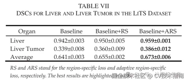 我们的方法在公共 LiTS 数据集上的 Dice 性能如表格 VII 所示。应用所提出的区域特定损失和自适应区域特定损失已经导致肝脏和肝脏肿瘤的自动分割结果得到改善。具体来说,肝脏的 DSC 从 0.942 提高到 0.950 和 0.959,肝脏肿瘤的 DSC 从 0.339 提高到 0.360 和 0.386。这些改进进一步验证了我们提出的损失范式的有效性。