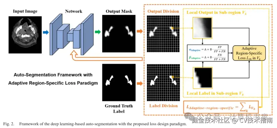 根据(7)和(8), 和 的值在[A, A+B]范围内变化,并分别随着FP和FN误差的比例线性增加。因此,根据训练过程中子区域内网络预测结果,损失函数对FP和FN误差的强调会自适应地进行微调。我们在本研究中经验性地将常数系数A和B设置为0.3和0.4,并在消融研究中进一步探索超参数调整范围的影响。请注意,在子区域中FP = FN的情况下, ,这意味着损失函数对两种预测误差给予同等的重要性,接近(4)。提出的具有自适应区域特定损失(6)-(8)的深度学习框架如图2所示。所提出的损失方案不仅提供了通过更多地关注难以预测的不同子区域的有效方法,而且还实现了在训练过程中根据自动调整的函数参数对每个子区域进行自适应误差惩罚,这有望实现更有效的自动分割学习。